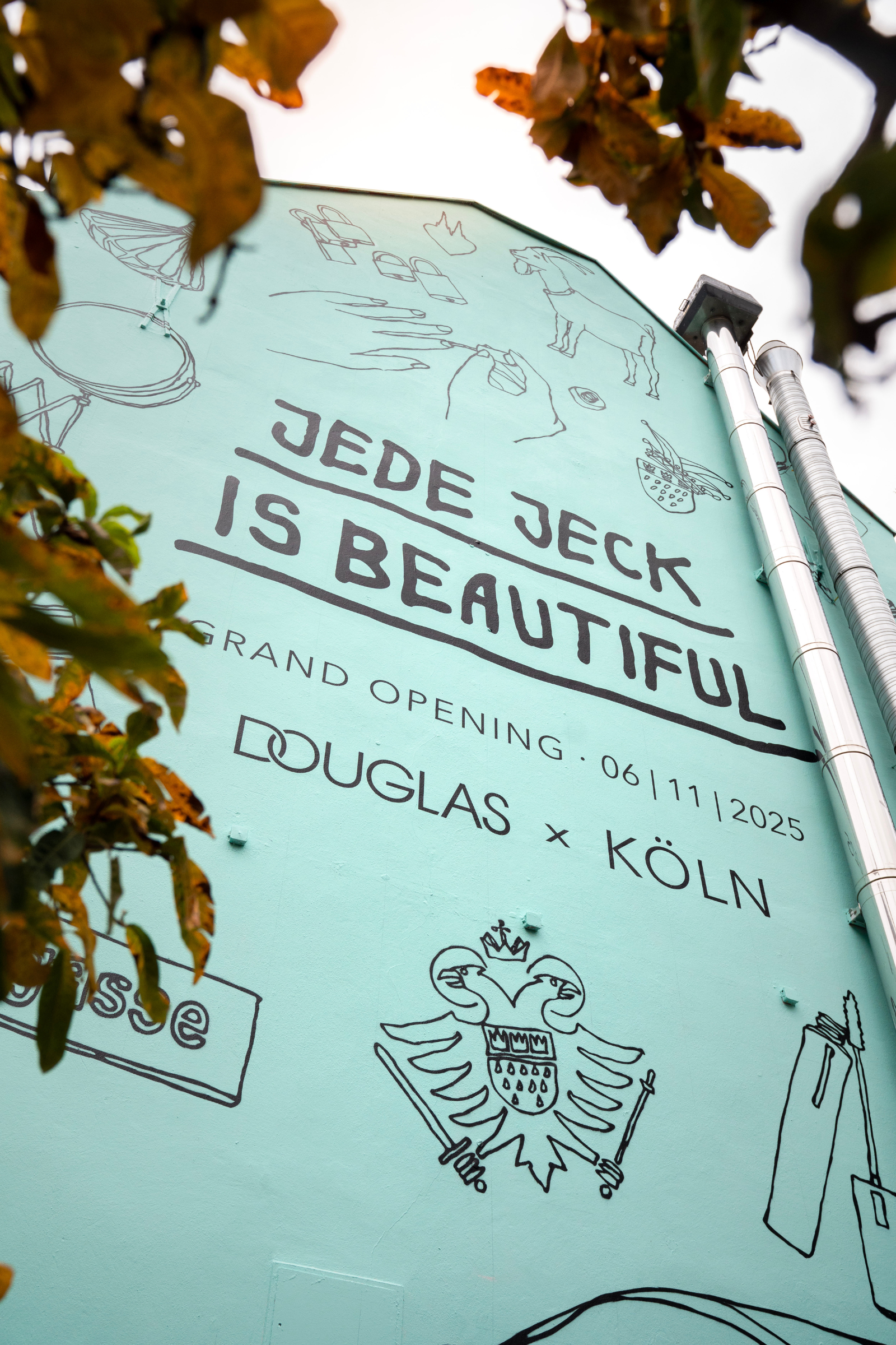 Seit Anfang Oktober sorgt die Kampagne für eine starke Präsenz im Kölner Alltag. Ein großflächiges Wandmural am Friesenplatz und eine hinterleuchtete City-Light-Säule setzen den Claim prominent ins Stadtbild. Zusätzlich fährt eine vollgebrandete KVB-Bahn auf zentralen Linien durch Köln und bringt die Botschaft in den Alltag der Kölner:innen. Wildplakatierungen rund um bekannte SzeneLocations, der Einsatz mobiler Promoter mit DOUGLAS-Plakaten sowie die Verteilung von Stickern und Pins in Cafés und Bars machen die Kampagne in verschiedenen Teilen der Stadt sichtbar und bringen sie in den Alltag der Menschen in Köln.