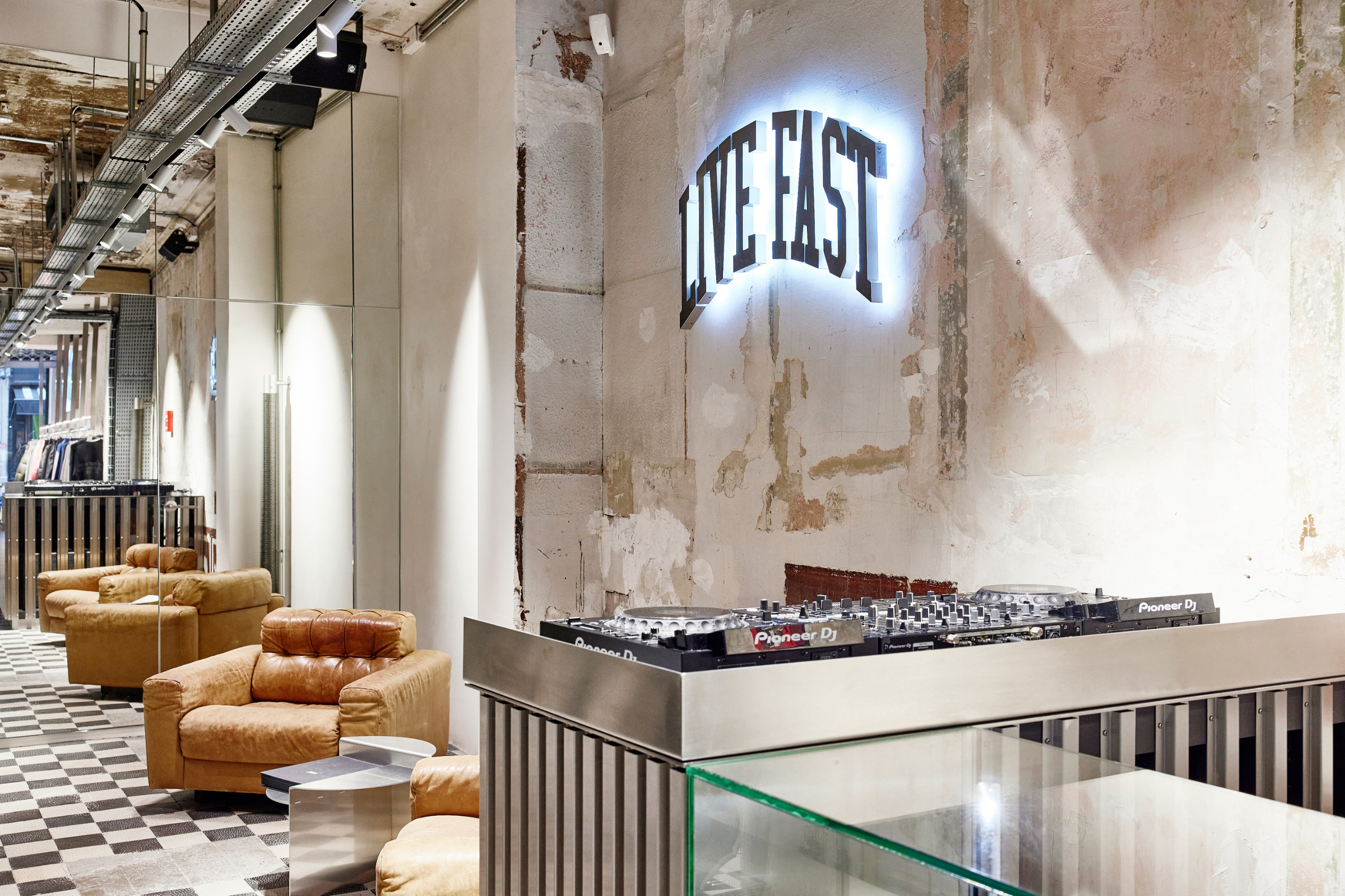 Der rund 100 qm große LFDY Store im Herzen Marais bewahrt den Charakter des historischen Gebäudes und integriert die vielschichtigen Spuren der Vergangenheit in das moderne StoreDesign. Offene Wände mit verblassten Malereien, gusseiserne Säulen und der originale Fliesenboden bilden den Rahmen für die LFDY Signature. Die polierten Edelstahlmöbel mit